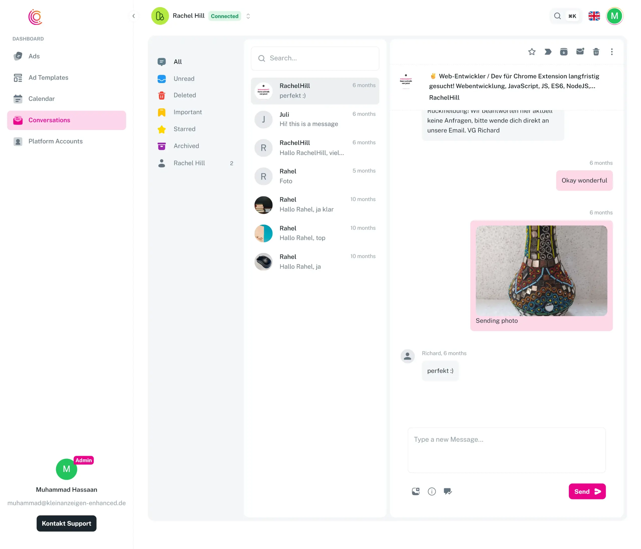 - Intelligent Chatbox: We pulled all conversations from the platform and organized them into a single, clean interface. No more sifting through notifications; every conversation was tracked and easily accessible.
